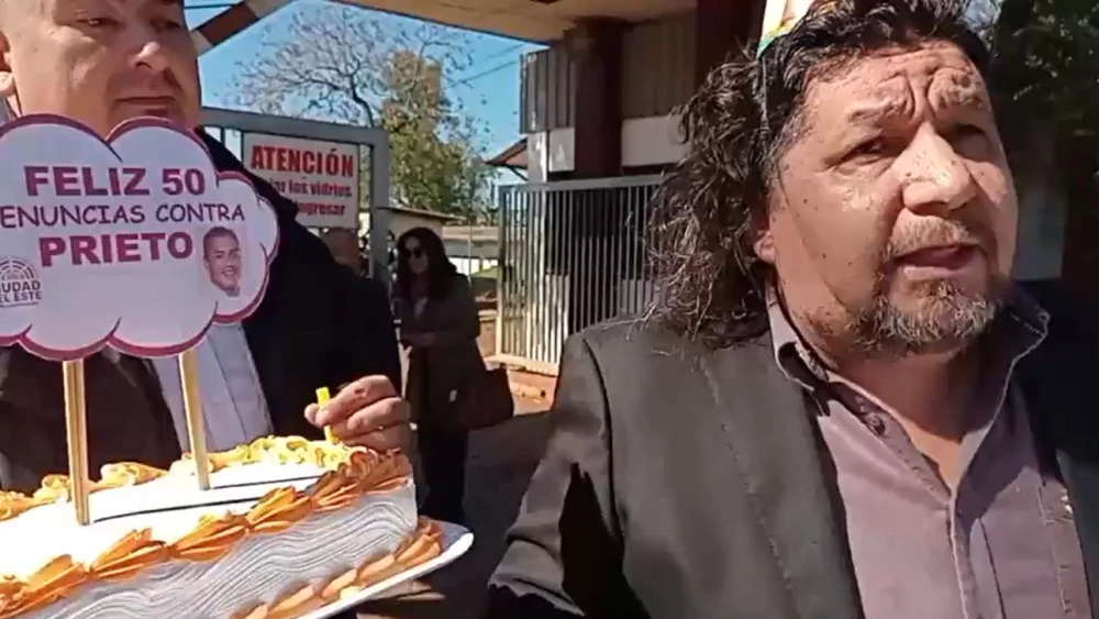 El ex concejal municipal Celso Kelembu Miranda acudió este martes al Ministerio Público para presentar la denuncia número 50 contra el intendente apartado Miguel Prieto Vallejos. En un gesto poco habitual, Kelembu llevó una torta, gorro de cumpleaños y chocolate caliente para “celebrar” la cifra alcanzada.