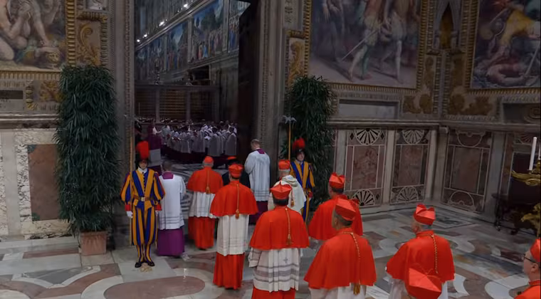 Los purpurados realizaron una procesión solemne desde la Capilla Paulina hasta la Capilla Sixtina, entonando las Letanías a los Santos durante la breve caminata.