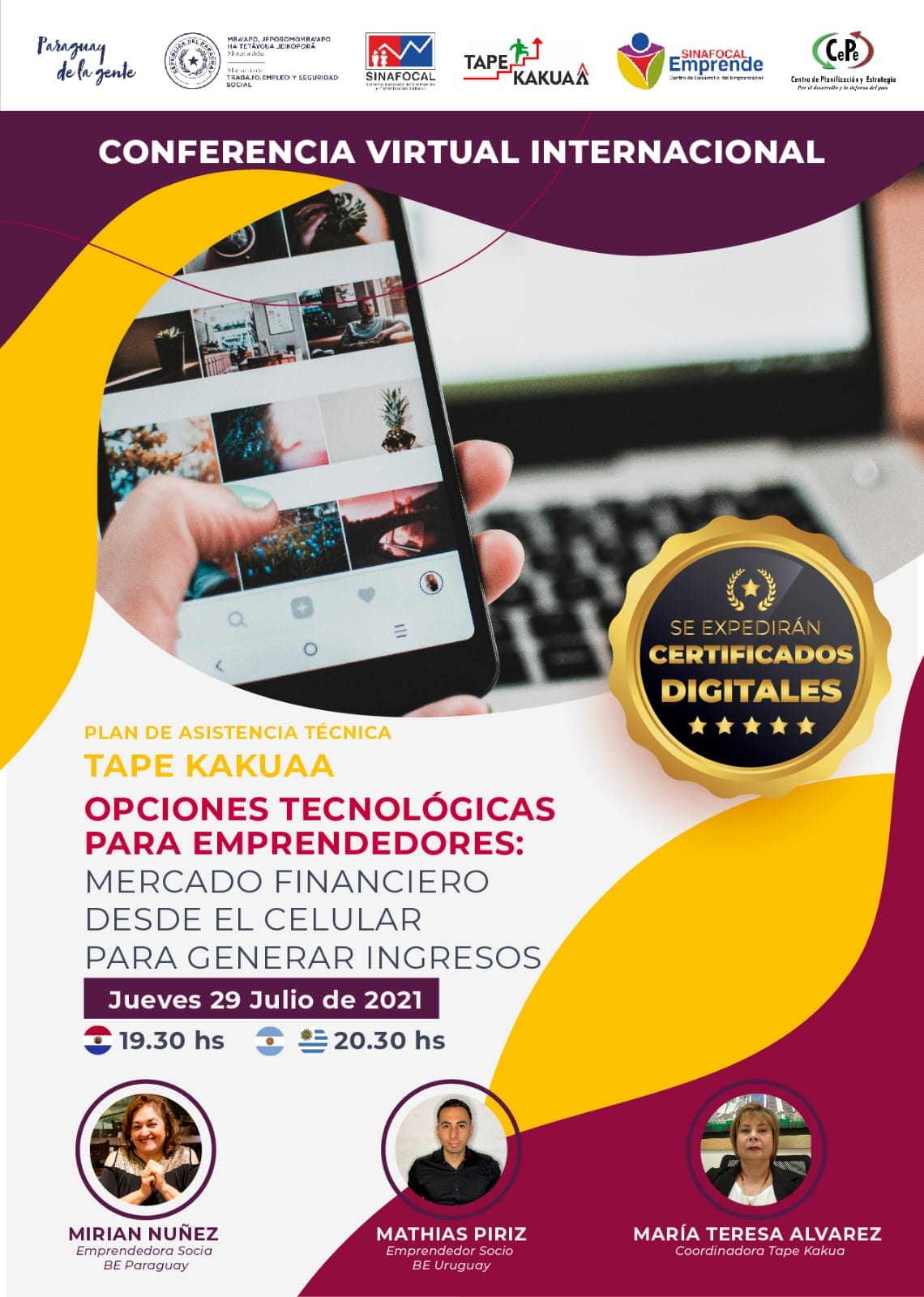 El Sistema Nacional de Formación y Capacitación Laboral (Sinafocal) y el Centro de Planificación y Estrategia (CEPE) invitan a participar de la conferencia virtual internacional a realizarse mañana jueves a las 19:30 horas. Bajo la denominación “Opciones Tecnológicas para Emprendedores: Mercado Financiero desde el celular para generar ingresos el encuentro busca brindar nuevas herramientas para el sector y acompañar el desarrollo de los emprendedores locales.