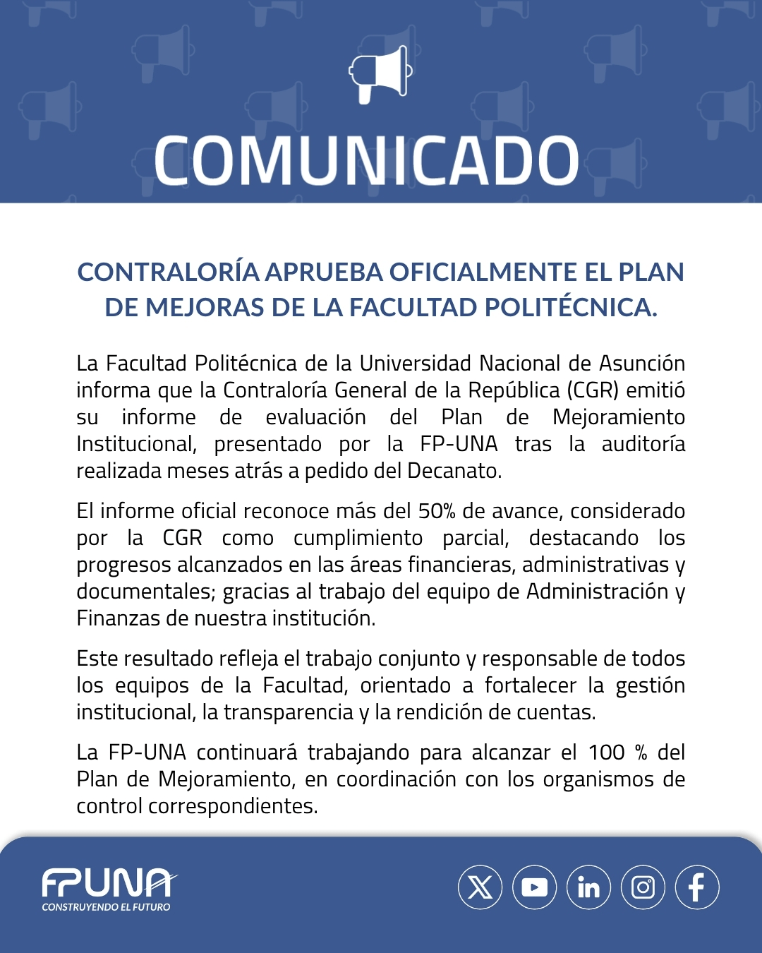 La Facultad Politécnica de la Universidad Nacional de Asunción (FP-UNA) informó que la Contraloría General de la República (CGR) emitió su informe oficial de evaluación sobre el «Plan de Mejoramiento Institucional» presentado por la casa de estudios, en cumplimiento de las recomendaciones formuladas tras la auditoría practicada anteriormente.