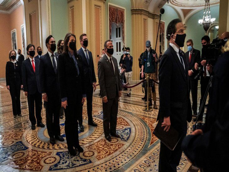 Los nueve congresistas que actuarán de fiscales en el juicio se presentaron ante el pleno del Senado y uno de ellos, Jamie Raskin, leyó íntegramente la acusación contra Trump aprobada en la Cámara Baja, el 13 de enero, una semana después del asalto.