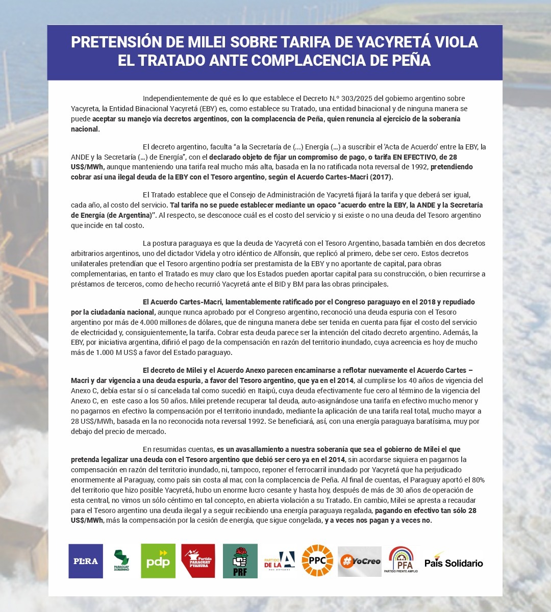 Independientemente de qué es lo que establece el Decreto N.º 303/2025 del gobierno argentino sobre Yacyreta, la Entidad Binacional Yacyretá (EBY) es, como establece su Tratado, una entidad binacional y de ninguna manera se puede aceptar su manejo vía decretos argentinos, con la complacencia de Peña, quien renuncia al ejercicio de la soberanía nacional.