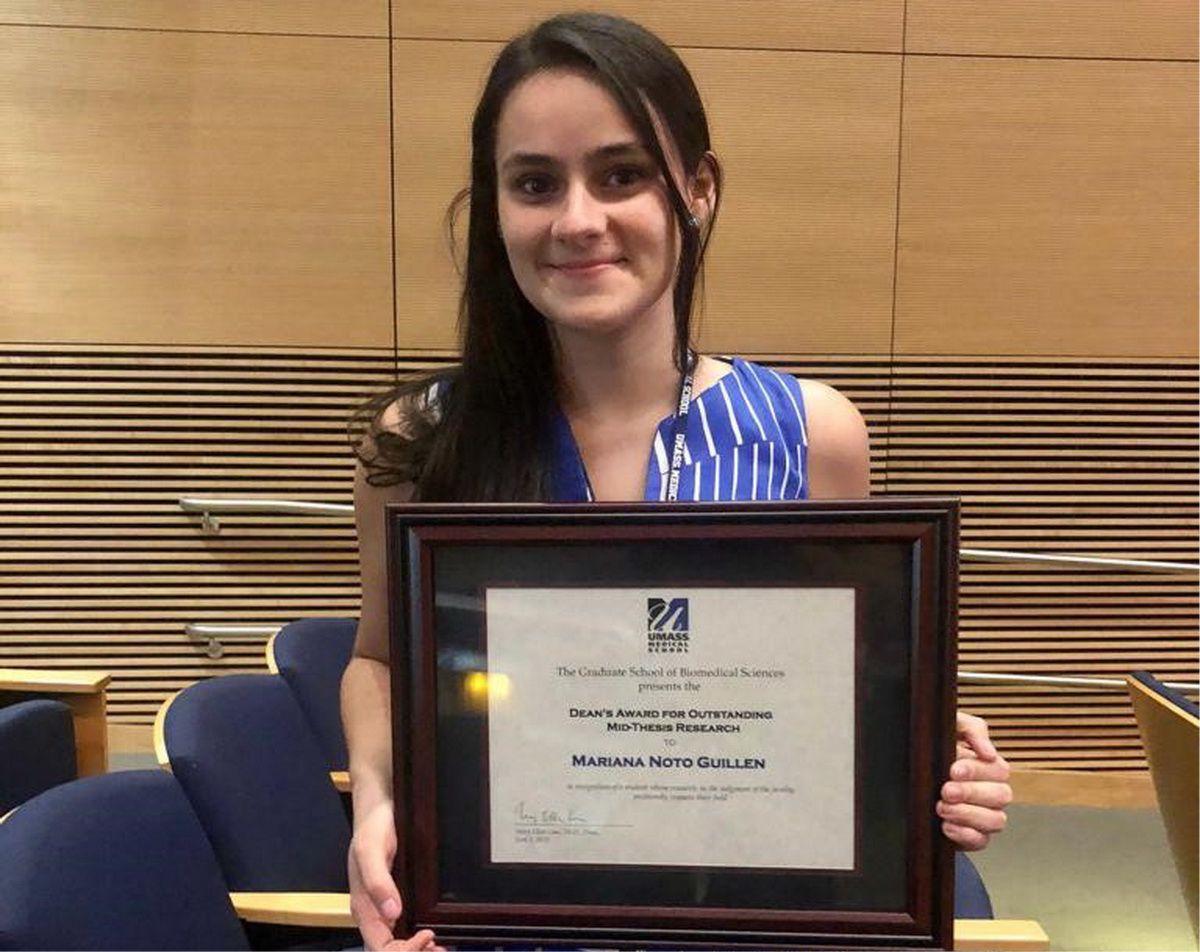 Mariana Noto Guillén se encuentra realizando su doctorado en la Escuela de Ciencias Biomédicas de la Universidad de Massachusetts, Boston, EEUU, donde en el marco del desarrollo y presentación de su tesis doctoral fue premiada por el decano de la institución.