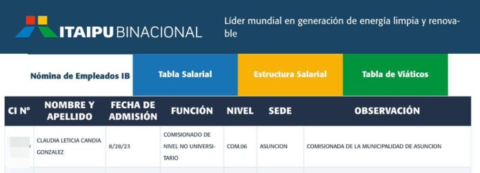 Claudia Leticia Candia González, funcionaria de la Municipalidad de Asunción, fue comisionada a Itaipú . Esta “escalada” se da luego del presunto romance con el apoderado de la ANR Eduardo González, quien a su vez es asesor jurídico de Yacyretá.