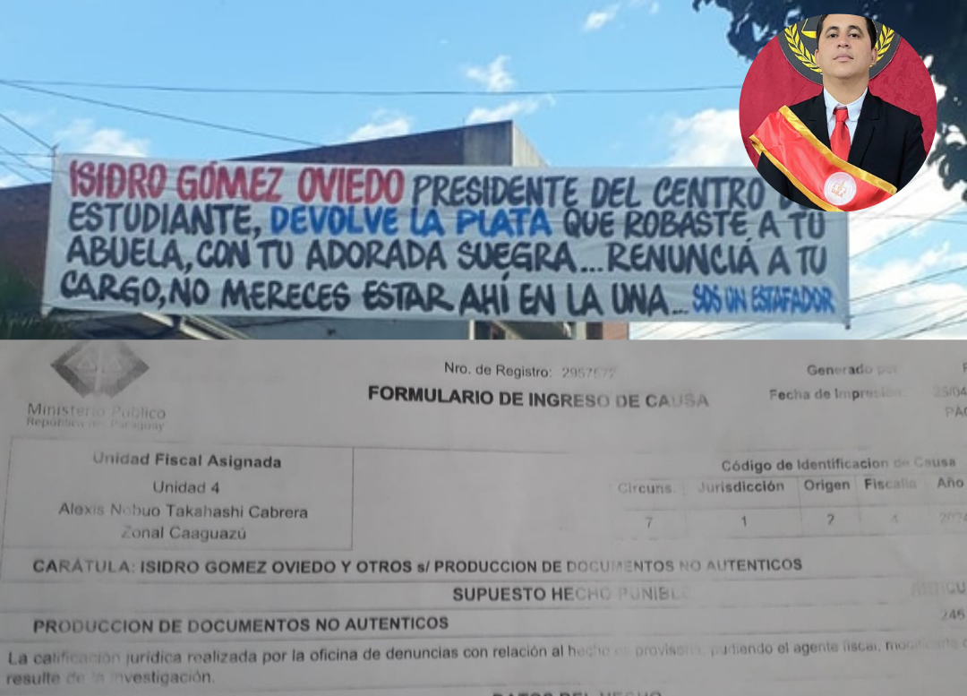 “Isidro Gómez Oviedo, devolvé la plata que robaste a tu abuela, renuncia a tu cargo. No mereces estar ahí en la UNA”, dice parte del feroz pasacalles que colocaron para el presidente del Centro de Estudiantes de la facultad de Derecho de la Universidad Nacional de Caaguazú.