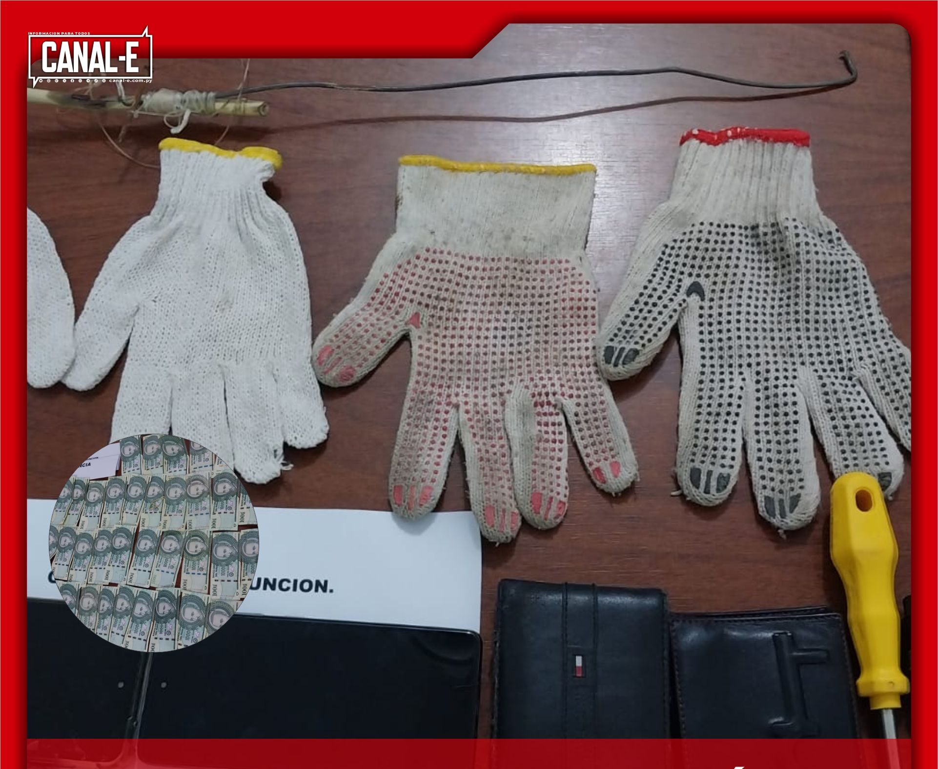 Agentes de la Comisaría 7ma. De Asunción tras una persecución lograron aprehender a estos hombres que escapaba a bordo de un automóvil de la marca Hyundai Accent, en el poder de los mismos fue incautado: guantes, destornilladores y tres billeteras; dos llaves de vehículos y un gancho de alambre.