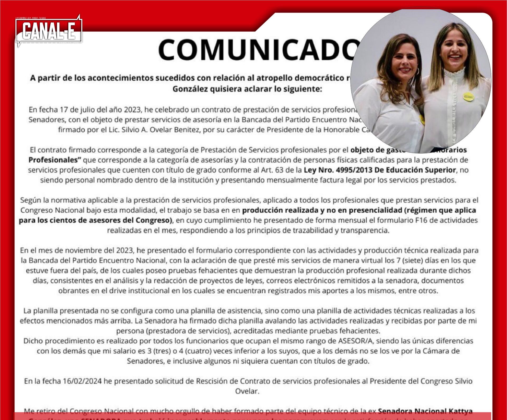 «En el mes de noviembre del 2023 he presentado el formulario correspondiente con las actividades y producción técnicas realizada para la bancada del Partido Encuentro Nacional, con la aclaración de que presté mis servicios de manera virtual por 7 días en los que me estuve fuera del país, de los cuales poseo pruebas fehacientes que demuestran la producción profesional realizada durante dichos días, consistentes en el análisis y la  redacción de proyectos de  leyes, correos  electrónicos  remitidos  la  senadora, documentos obrantes en el drive institucional en los cuales se encuentran registrados mis aportes a los mismos…» mencionaba la exfuncionaria  de Kattya.