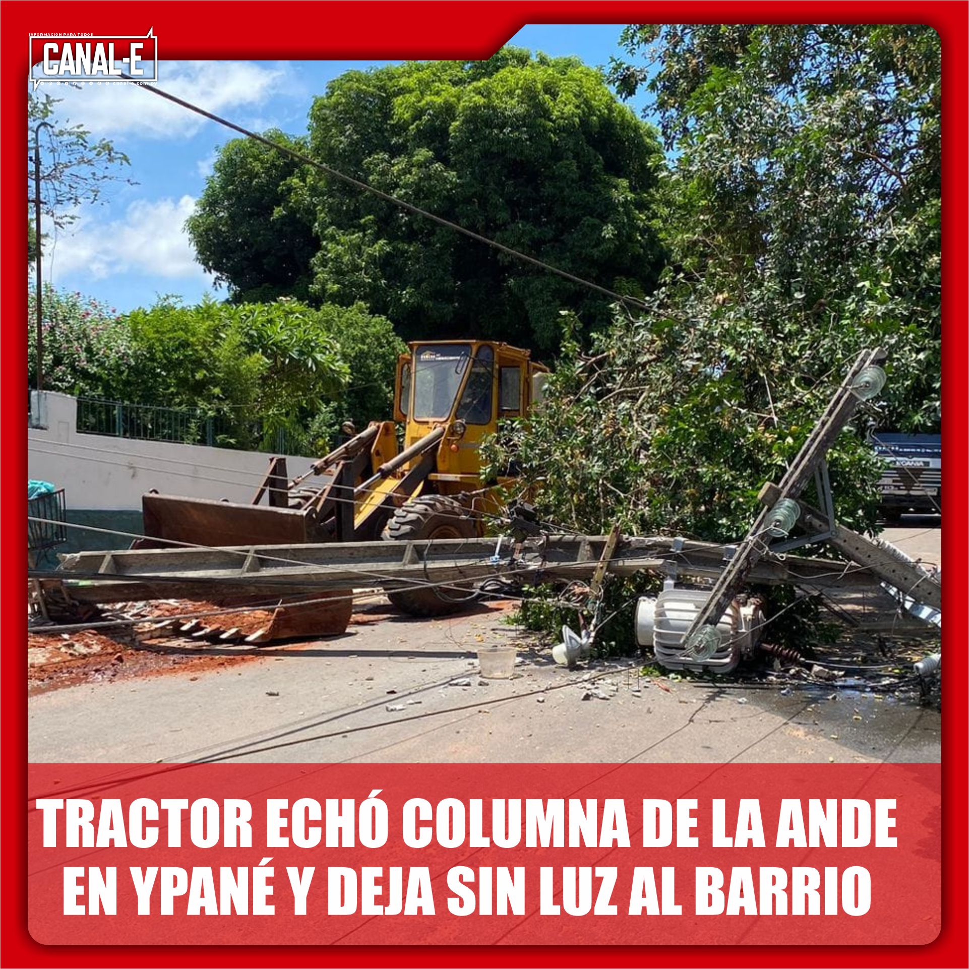 En la tarde de este miércoles un tractor se llevó una columna y un transformador de la ANDE, también cayeron otras columnas debido a la tensión ejercida al momento del impacto.