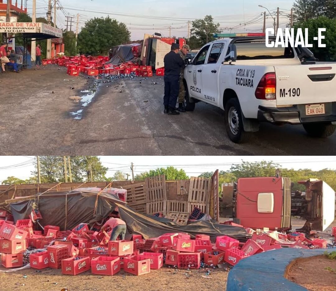 Esta madrugada un camión repartidor de cervezas sufrió un accidente en el cruce de Tacuara en Santaní y toda su carga terminó en la capa asfáltica.